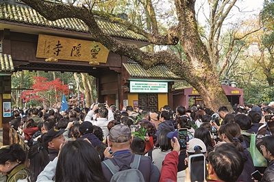 图为昨天一早,第一批市民游客在灵隐飞来峰景区检票口外排队等候。商报记者 梁孟澄 摄影报道