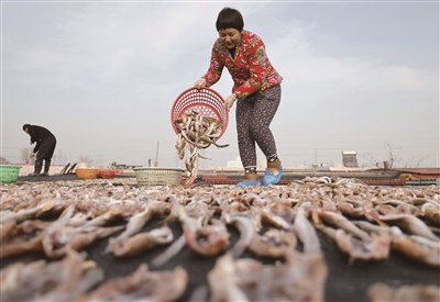 初冬时节,河北省唐山市丰南区黑沿子镇的渔民利用晴好天气,将捕捞的鱼虾等海产品进行加工、晾晒,供应市场。