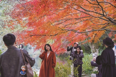 “枫”景诱人 眼下,西湖景区已进入红枫最佳观赏期,藏在花港观鱼、九溪烟树、灵隐路等各个景点的“枫”景,枫叶色彩斑斓,有的嫣红似火,有的橙黄如霞,演绎着一首热烈的交响曲,吸引很多市民游客慕名前来赏枫拍照。图为昨天游客在花港观鱼打卡红枫。商报记者 项凯 摄影报道