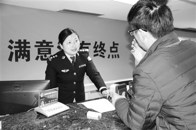 俞洁(左一)正在为市民办理窗口受理业务