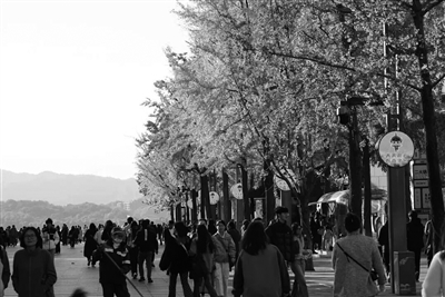 每当秋意正浓,湖滨步行街两旁的银杏树叶渐次由翠绿转为金黄,层层叠叠,灿若云锦,为这个季节增添了几分诗意。