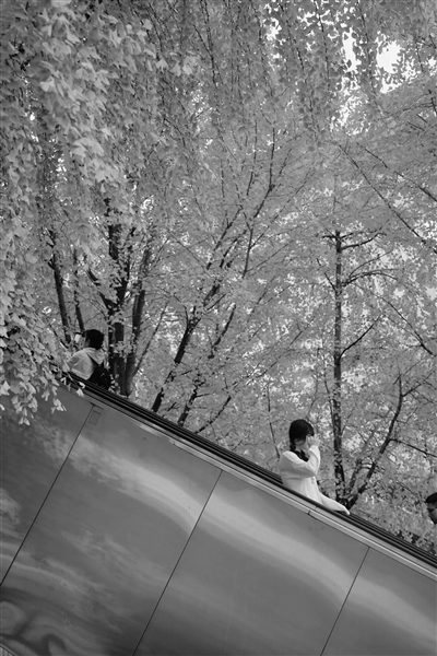 杭州大厦C座扶梯旁的银杏别具特色,搭乘扶梯缓缓而上,仿佛穿梭在一片金色雨帘中,现代建筑与自然之景完美融合。