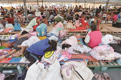 12月8日,在泰国武里南府,撤离边境省份的民众在一处避难所休息。泰国陆军第二军区8日在社交媒体上发表声明说,目前泰柬边境4个省份已有约70%的平民完成撤离,约3.5万人在临时安置点登记。尚未进入安置点的民众据推测暂居亲属家中,或仍在转移途中。撤离过程中,有1名平民因病不幸身亡。