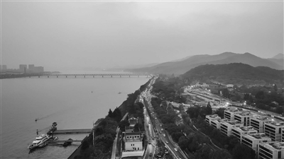 昨天,冷空气南下,上游污染物输入,整个杭城看起来灰蒙蒙的,靠近水澄桥地铁站的钱塘江面上,天空被霾笼罩。摄影 商报记者 项凯