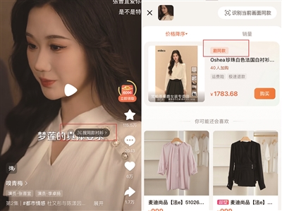 记者打开红果APP,随机点播短剧《分手后,我娶了前任的老板》时发现,在视频暂停过程中,画面会根据内容出现“搜同款衬衫”“搜同款耳钉”“搜同款背心”等购物标识。不过,该功能并非每次暂停都会触发,且在现代题材剧集中,“搜同款”标识的出现频率明显高于古装剧。用户若有购买意向,点击链接即可跳转至抖音APP完成支付。需要注意的是,部分展示的“同款”商品与剧中服饰的实际相似度仍有差距。