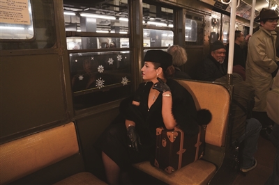 纽约:乘坐“怀旧地铁” 12月14日,在美国纽约,一名女子身着怀旧服饰乘坐“怀旧地铁”。乘坐“怀旧地铁”是美国纽约的一项年度节庆活动,部分乘客身着怀旧服饰前来搭乘老式地铁列车,感受时光回溯的奇妙体验。