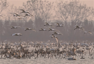 12月17日,白琵鹭等候鸟在南昌五星白鹤保护小区内栖息飞翔。冬日时节,鄱阳湖畔的该保护小区迎来候鸟栖息高峰。白鹤、天鹅、白琵鹭等候鸟在湿地中成群翔集,觅食嬉戏,享受冬日暖阳。