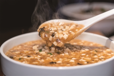 “像绍兴人家里做这道菜,不会局限在食材,主料是嫩豆腐,但是其他食材可以根据时令替换变动,像我们现在做西施豆腐用的就是鸡胗、木耳、香菇、茭白、肉末等。”陈剑华说。西施豆腐做法简单,但滋味颇丰。水嫩的豆腐借了猪肉的香、蔬菜的鲜、鸡胗的脆,一口下去,软嫩与爽脆在舌尖碰撞,鲜味儿直钻鼻腔,满是绍兴人家的烟火温情。