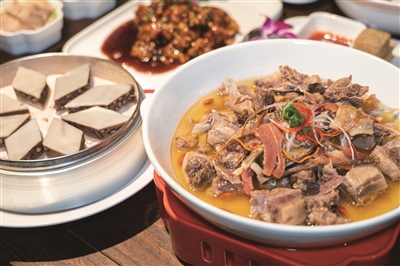 厨师、食材,都是陈剑华从绍兴当地带过来的。“像我们的西施豆腐、菜蔀头河虾、干菜焖肉、火腿蒸吊鸭,都是我觉得值得一试的。”陈剑华介绍。餐厅设计也别出心裁,二楼的就餐区,乌篷船布被陈剑华用来做了吊顶、四处收集来的老物件——四方桌、酒壶、坛子,被他摆放在餐厅各处。