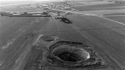 12月18日无人机航拍显示,土耳其科尼亚省一处农田出现塌陷坑。