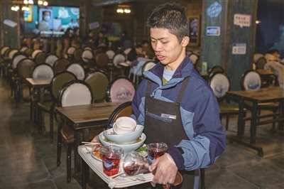 王艺涵的岗位是前厅服务员,负责收拾客人吃完的餐盘,是三位心青年中每天走路步数最多的。日常的工作内容,他现在已经驾轻就熟,新的困难来自生活。