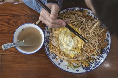 堂吃第一天,王艺涵点了牛肉拌面加一个荷包蛋。