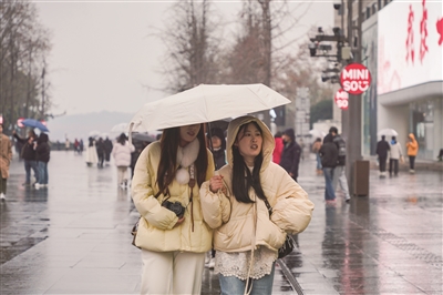 昨天是元旦假期后首个工作日。受高空槽和弱冷空气影响,当天下午到夜里有降水过程,体感格外阴冷。据市气象台消息,今天起雨水将暂歇,本周开启晴冷模式,早晚依旧寒意十足,请大家出行注意保暖。图为昨天下午西湖边,游客撑着伞穿着厚外套出行。