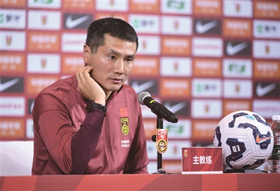1月4日,中国国家男子足球队在广东肇庆举行媒体见面会,主教练邵佳一正式亮相。这是邵佳一在媒体见面会现场。