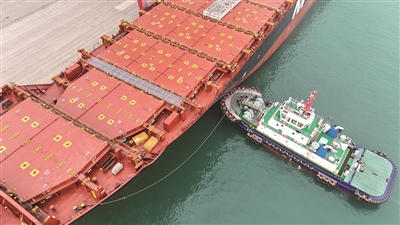 1月4日,澳洲直航新航线首班船舶靠泊山东青岛港,标志着该港2026年首条外贸新航线正式开通。这是澳洲直航新航线首班船舶“地中海杰西尼亚”轮靠泊青岛港(无人机照片)。
