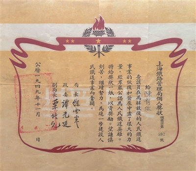 1949年11月上海铁路管理局个人奖状