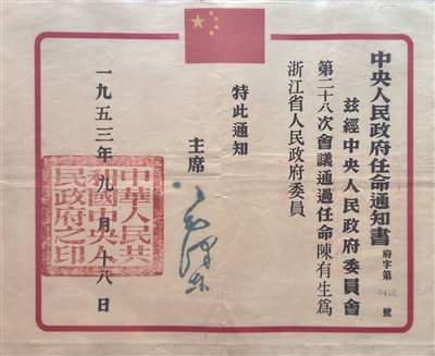 1953年,毛主席签署的中央人民政府任命通知书敲锣打鼓地送到了杭州六和塔边的陈有生家里,任命他为中央人民政府委员会浙江省人民政府委员,这份沉甸甸的任命书,纸页间印刻着领袖的嘱托,字里行间承载着人民的期许。