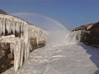 “冰瀑玉壶”现彩虹 1月6日在山西吉县黄河壶口瀑布景区拍摄的“冰瀑玉壶”和彩虹景观。受持续降温天气影响,位于山西吉县和陕西宜川县交界的黄河壶口瀑布形成“冰瀑玉壶”壮美景观,层层叠叠的冰瀑与瀑布上空的彩虹相映成趣,美不胜收。