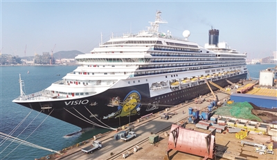1月7日,“理想”号大型邮轮在中国船舶集团青岛北海造船有限公司厂区内进行维修(无人机照片)。该邮轮是来自意大利芬坎蒂尼船厂的10.3万总吨邮轮,2025年12月24日进场开展常规修理。这是继“梦想”号之后该公司承接的第二艘大型邮轮修理项目。