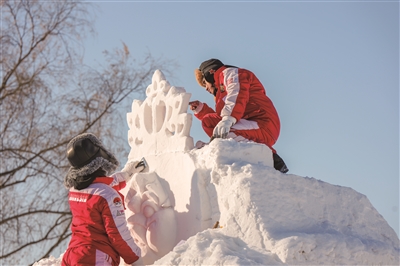 1月7日,在哈尔滨太阳岛雪博会第28届中国·哈尔滨国际雪雕比赛现场,来自13个国家25支代表队的百余位艺术家在进行雪雕创作。这是艺术家们在寒冬中精雕细琢雪雕作品。