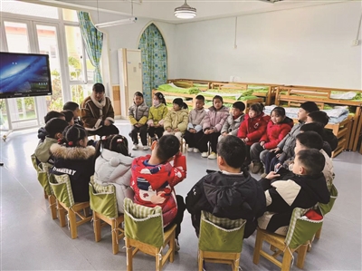 “暖冬”环节里,孩子们结合生活经验,分享戴围巾、穿棉衣、多喝热水、运动取暖等保暖妙招,还动手制作“保暖小贴士”海报提醒同伴。惦记着园内的小树,孩子们自发当起“护树小卫士”,找来干草、麻绳为梧桐树缠上草绳,在树根铺厚厚的落叶,用稚嫩行动为树木送去温暖。