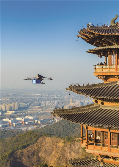图为昨天无人机正将外卖配送至望宸阁的“空投餐厅”。 通讯员 余文华 商报记者 项凯 摄影报道