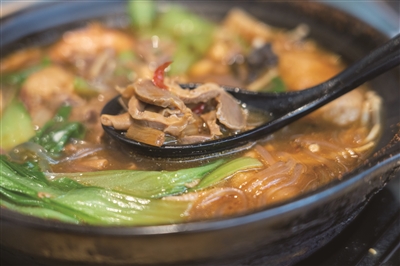 没等几分钟,冒着热气的鸡杂砂锅就端上来了,砂锅还在咕嘟咕嘟冒泡,汤汁滚着小泡往外溢,光看这架势,口水就忍不住往下咽。