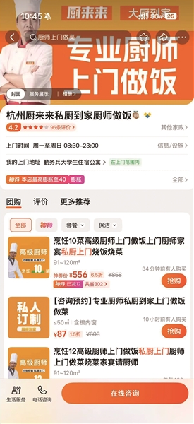 记者在美团等生活服务平台上就看到,有商家都推出了这类服务。杭州厨来来品牌的商家介绍,他们就可以上门做年夜饭。价格方面,2月15日-19日期间,他们做1-15道菜定价1880元每桌、16-20道菜2080元每桌、21-25道菜2280元每桌,食材需要雇主自行准备。同时,还提供多项收费的增值服务,如代买食材、餐后洗碗、活杀等。
