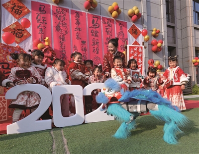1月14日,四川省遂宁市高新区瑰宝明珠幼儿园举办迎新春非遗庙会,一只身披舞狮服的机器狗在活动上亮相,为师生送来温馨祝福。
