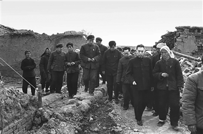 1966年,周恩来(前排左一)在河北省隆尧县白家寨公社白家寨大队视察地震情况。据新华社