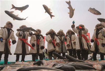 当日,新疆巴音郭楞蒙古自治州博湖县境内的博斯腾湖大河口景区举行巨网冬捕活动,吸引各地游客前来观赏。