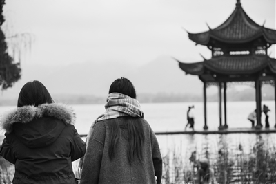 昨天中午,游客穿着厚外套在西湖边游玩。摄影 商报记者 项凯