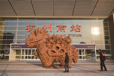近日,钱江世纪城联合中国美术学院,以“生命·无界”为主题,打造了五组匠心独具的落叶艺术装置,分布于钱江世纪城公园、H07公园以及杭州南站枢纽。图为昨天杭州南站西广场二楼进站口旁,落叶萌马《马上来》以憨态可掬的外形,向旅客传递对马年的美好祝愿。