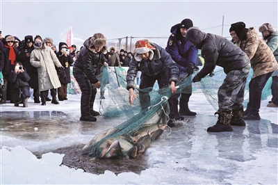 1月23日,作为黑龙江省“冷水鱼·冬捕季”分会场之一,该省同江市在街津口赫哲族乡修恩湖畔举行冬捕活动。本次活动融合民族渔猎、民俗体育等内容,让人们感受赫哲民俗文化魅力。这是街津口赫哲族乡的冬捕活动现场。
