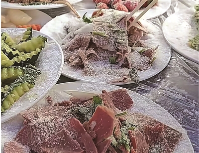 近日,网友王先生反映,他在河南周口市太康县马头镇一村民家中吃席时,雪花飘落在牛肉凉菜上,成了正宗的雪花牛肉。1月20日,记者获悉,这是村民摆的白事流水席,在室外搭了帐篷,雪较大,吹到了餐桌上。