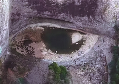 从视频画面可见,这只“龙眼”整体轮廓清晰:潭中央残留的深绿色水域宛如深邃的“瞳孔”,周围浅米色与灰褐色岩壁构成了“眼白”,上方深色岩石凹陷则形似“上眼睑”褶皱,还能看到清晰的“双眼皮”,整只“眼睛”镶嵌在灰白色崖壁底部,与下方深绿树林形成鲜明对比,更显生动立体。