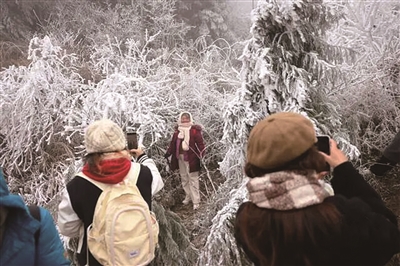 21日,位于湖南永州蓝山县与广东连州市交界处的云冰山迎来冰雪美景,雾凇满枝,吸引了不少慕名而来赏雪的游客,其中不少是广东的游客。有游客说,从广州自驾到这里看雾凇路上用了四小时。