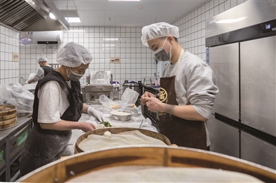 店里的厨房紧挨着过道,明档厨房一览无余,路过的人都能看到师傅怎么和面、怎么调馅、怎么包包子。“大家看得清清楚楚,吃得才放心。”刘心雨认为,这样才是对顾客最好的保证。