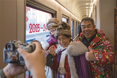 1月25日,在黑龙江省哈尔滨开往亚布力方向的Y783次“悠享龙江·银旅号”旅游列车上,旅客们换上各式服装,体验免费旅拍服务。这是国铁哈局集团今年开行的首趟旅拍列车,车体升级,空间更大,为旅客打造移动“照相馆”。这是旅客在Y783列车上拍照。