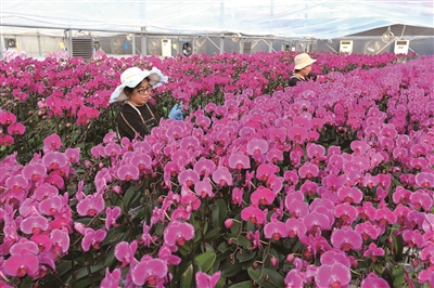 1月25日,花农在山东省青岛市即墨区灵山花卉文化产业园管护花卉。春节临近,灵山花卉文化产业园的年宵花迎来生产和销售旺季,花卉大棚内的蝴蝶兰、长寿花、仙客来等竞相绽放,花农们按照订单外运各类花卉,供应节日市场。