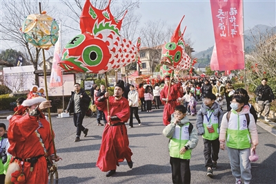 周六的清晨,天空澄澈湛蓝。我和家人早早动身,急匆匆赶到径山村,一场热闹的演出已经拉开了帷幕。这场活动,最让我印象深刻的,是满眼的中国红。红彤彤的舞台,红灿灿的狮子,红艳艳的对联,喜庆的气息扑面而来。身着盛装的演员们,接连带来了舞龙、舞狮、舞鱼灯、茶艺服装秀四项非遗表演,看得人目不暇接。