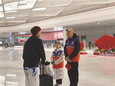 杭州市功勋志愿者马翔和小记者江奕霏为旅客提供指引服务