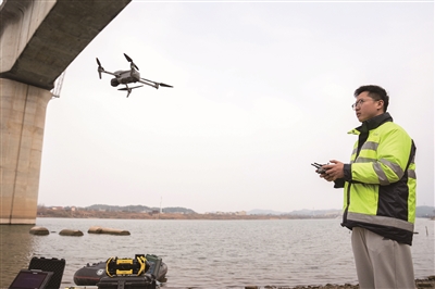 1月29日,在沪昆高铁湘江特大桥下,铁路工人操作无人机准备检测铁路桥墩上部结构外观。2026年春运即将启动,国铁广州局长沙高铁工务段工作人员运用无人测量船、水下机器人、无人机等新型设备,对铁路桥梁、桥墩、河道等进行检测,守护列车运行安全。