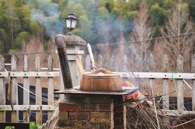 云泉约农家乐内的柴火灶,正在蒸当地外婆自制的青圆子