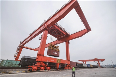 1月30日,在义乌铁路口岸,一列载着红酒、葵花籽油、气泡水等进口商品的中欧班列回程班列在卸货。春节临近,一列列自欧洲归来的中欧班列,正将西班牙的红酒、葵花籽油和气泡水,波兰的牛奶,法国的红酒等“洋年货”准时送抵义乌,堪称“移动的欧洲年货集市”。