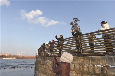 1月28日,游客在长白岛观鸟。坐落于松花江畔的吉林省吉林市长白岛湿地公园是鸟类栖息的乐园。岸边,90后护鸟人王婷婷每天守在这里,给鸟投食,观察栖息情况。1996年,王婷婷的姨夫任建国在长白岛附近以摆渡谋生,时常看到有人捕杀鸟类。他索性放下生意,成为一名护鸟人。2023年,王婷婷接过护鸟工作。她每天定时给鸟投食,观察鸟情,规范游客的观鸟活动,年均救助各种鸟类超过50只。