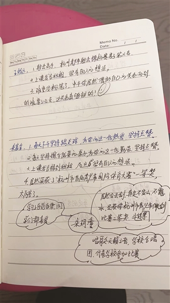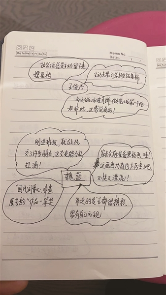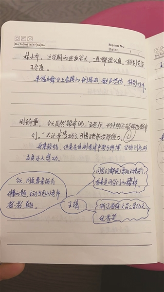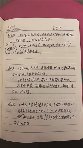为了写出“走心”评语,黄凌云养成了仔细观察与随手记录班上每一位学生的习惯:课堂上学生主动帮同学解答难题、运动会上为班级奋力冲刺,甚至是课间默默捡起走廊垃圾的小举动,都会被她记在小纸片或手机备忘录上。