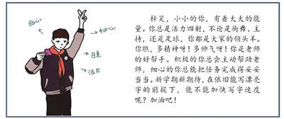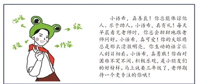 “小语希,真善良!你总能体谅他人、乐于助人。小语希,真有礼!每天早晨看见老师时,你总会甜甜地跟老师问好。小语希,真可爱!你的大眼睛总是那么清澈明亮,你生动的语言让人刮目相看。小语希,真勇敢!你面对困难不哭不闹、积极乐观,是小朋友们的好榜样。马上就要三年级了,老师期待一个更专注的你哦!”这是采荷二小朱子卉老师写给班上学生的“手绘评语”,除了文字外,还配有一幅学生形象的手绘画。