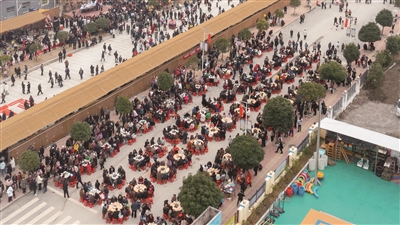 2月4日,贵州省铜仁市石阡县举办乡厨大赛,十余支村级参赛队伍进行了厨艺大比拼,现场展示本土特色菜品、传承民间烹饪技艺。活动现场还进行了多项非遗巡演,开设了农特产品和文创产品展销点。这是乡厨大赛期间进行的吃刨汤宴活动(无人机照片)。
