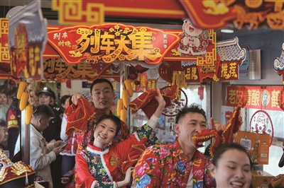 2月4日,黑龙江2026年首趟列车大集K7103次由哈尔滨始发,开往加格达奇。本次列车大集车厢悬挂火红灯笼、玉米串、红辣椒等,配以冰雪主题装饰与马年新春对联,营造出浓郁热烈的新年氛围。列车上设置专属展区,涵盖黑龙江省特色农产品以及铁路文创、非遗手工艺品等。这是在K7103次列车大集车厢内,身穿民俗服饰的乘务人员为旅客表演。